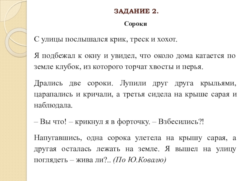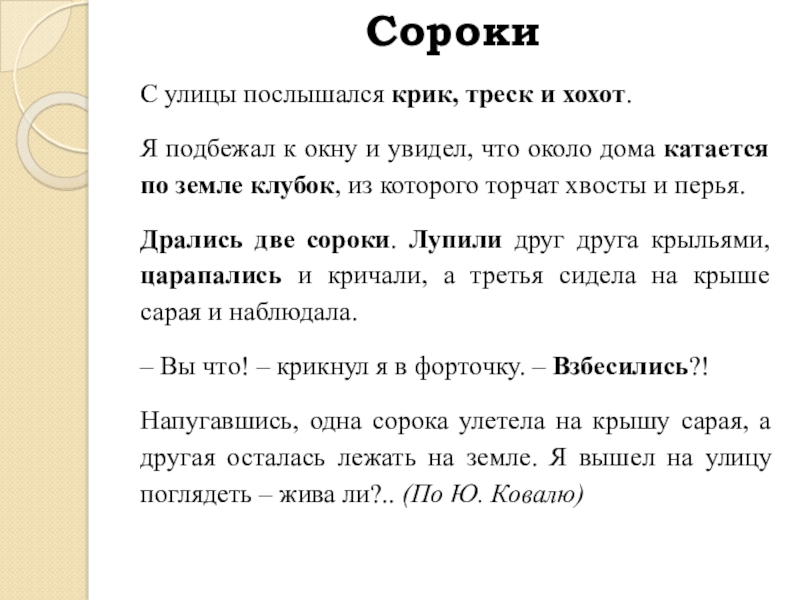 Напугавшись, одна сорока улетела на крышу сарая, а другая осталась лежать на земле. Я вышел на улицу поглядеть – жива ли?.. (По Ю.Ковалю)