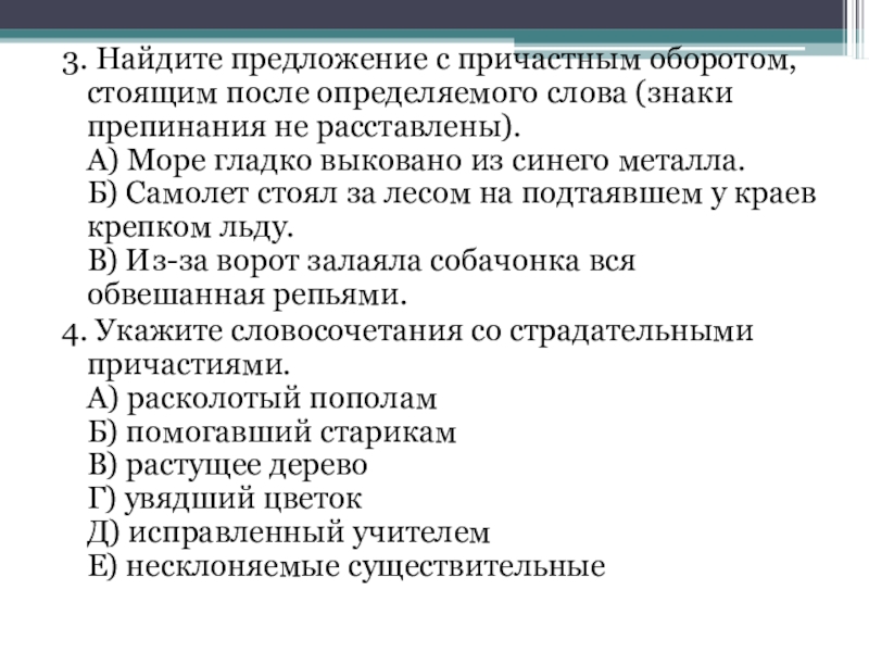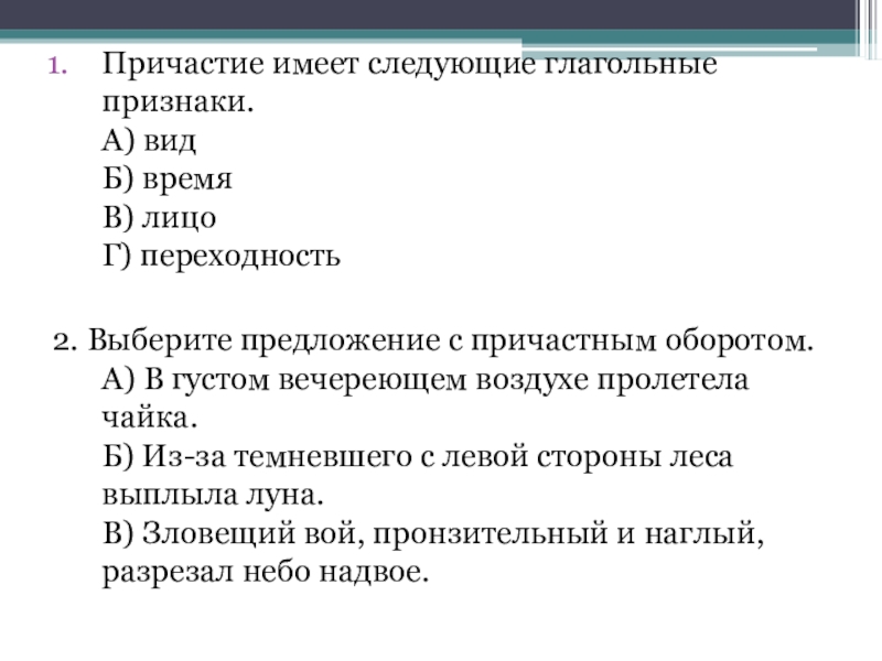 Причастие имеет следующие глагольные признаки. А) вид Б) время В) лицо Г) переходность2. Выберите предложение с причастным