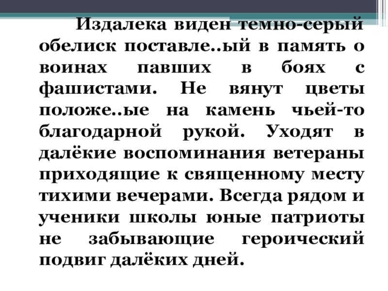 Издалека виден темно-серый обелиск поставле..ый в память о воинах павших в боях