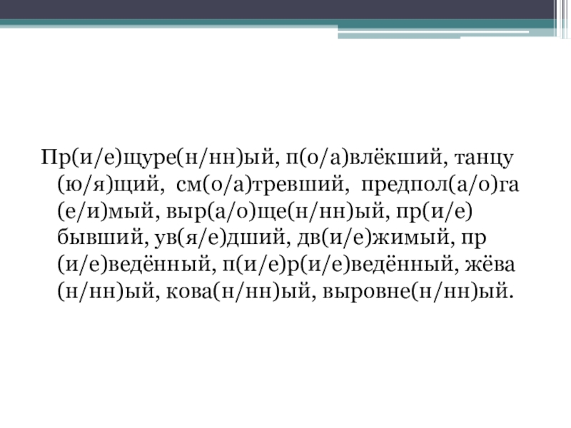 Пр(и/е)щуре(н/нн)ый, п(о/а)влёкший, танцу(ю/я)щий, см(о/а)тревший, предпол(а/о)га(е/и)мый, выр(а/о)ще(н/нн)ый, пр(и/е)бывший, ув(я/е)дший, дв(и/е)жимый, пр(и/е)ведённый, п(и/е)р(и/е)ведённый, жёва(н/нн)ый, кова(н/нн)ый, выровне(н/нн)ый.
