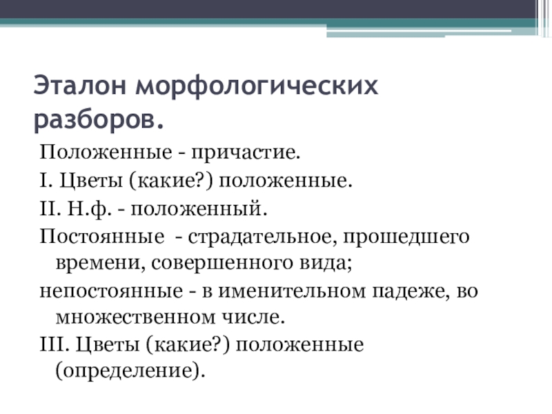 Презентация, доклад по русскому языку на тему Морфологический разбор причастия (7 класс)