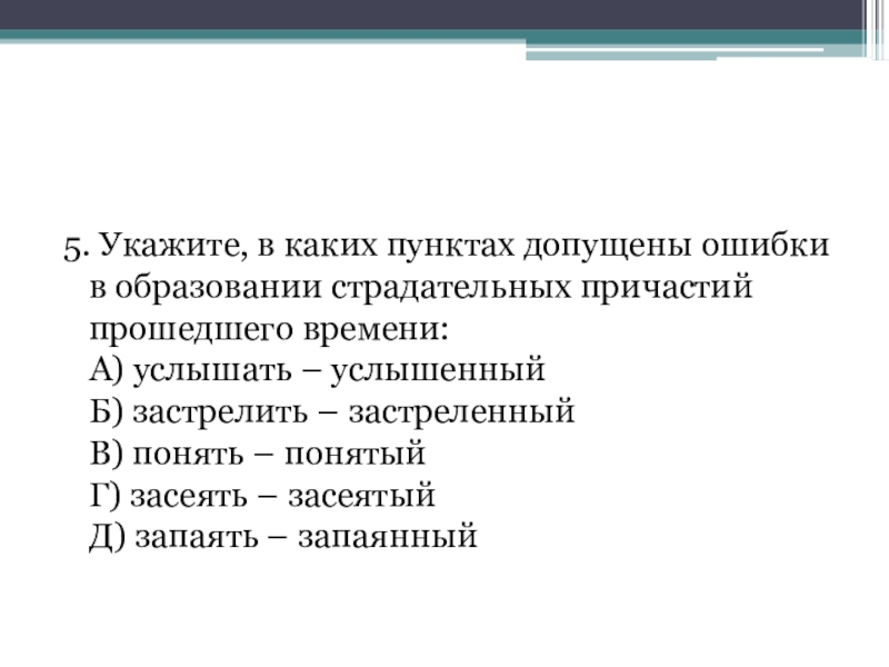 5. Укажите, в каких пунктах допущены ошибки в образовании страдательных причастий прошедшего времени: А) услышать – услышенный