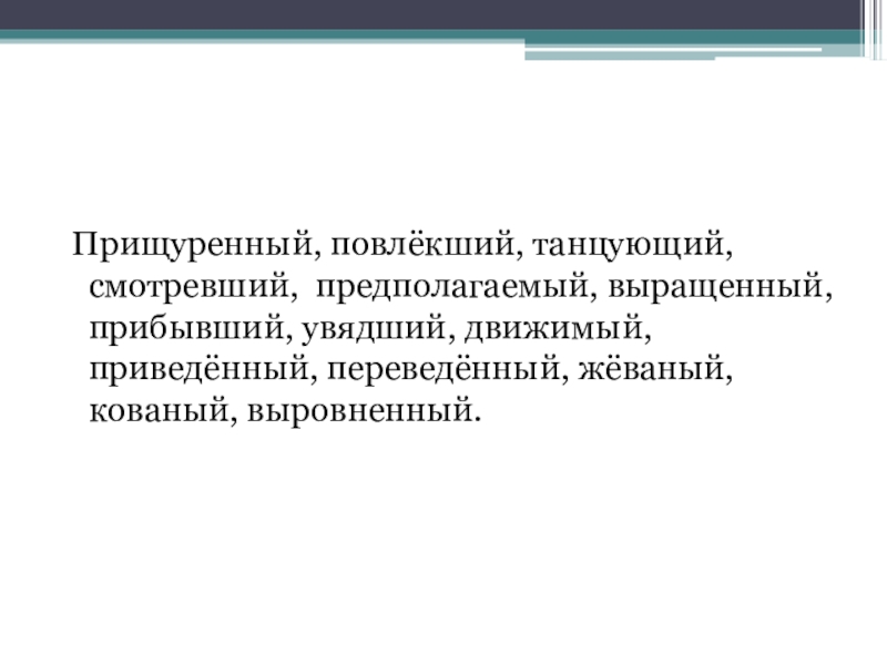Прищуренный, повлёкший, танцующий, смотревший, предполагаемый, выращенный, прибывший, увядший, движимый, приведённый, переведённый, жёваный, кованый, выровненный.