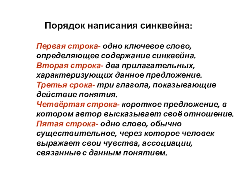 Пятая строка- одно слово, обычно существительное, через которое человек выражает свои чувства, ассоциации, связанные с данным понятием.
