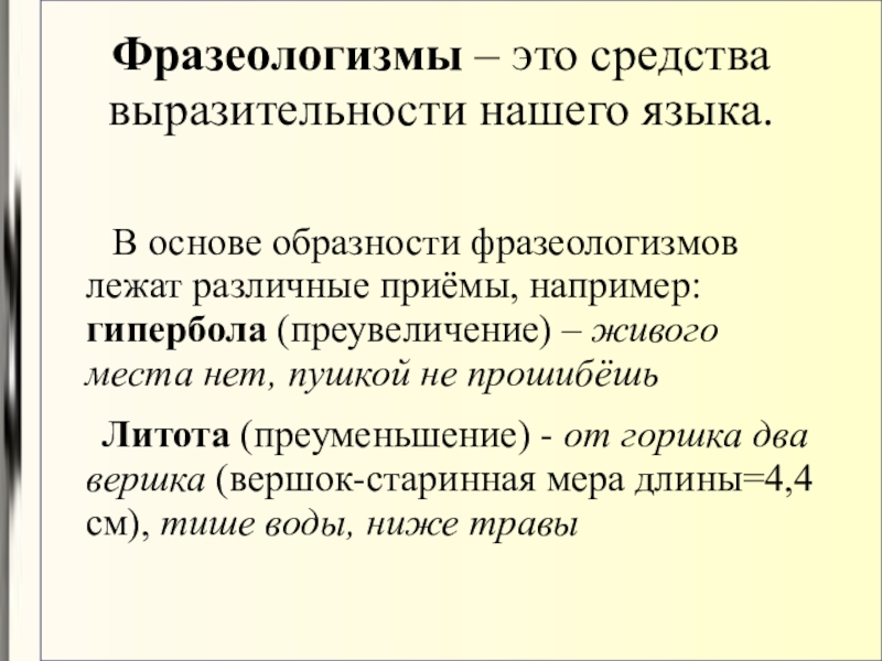 образности фразеологизмов лежат различные приёмы, например: гипербола (преувеличение) – живого места нет, пушкой не прошибёшь