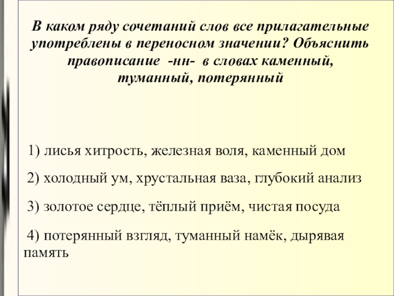 Слайд 7В каком ряду сочетаний слов все прилагательные употреблены в переносном значении?