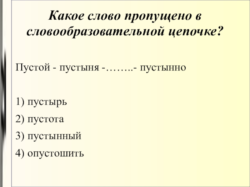 Слайд 13Какое слово пропущено в словообразовательной цепочке?