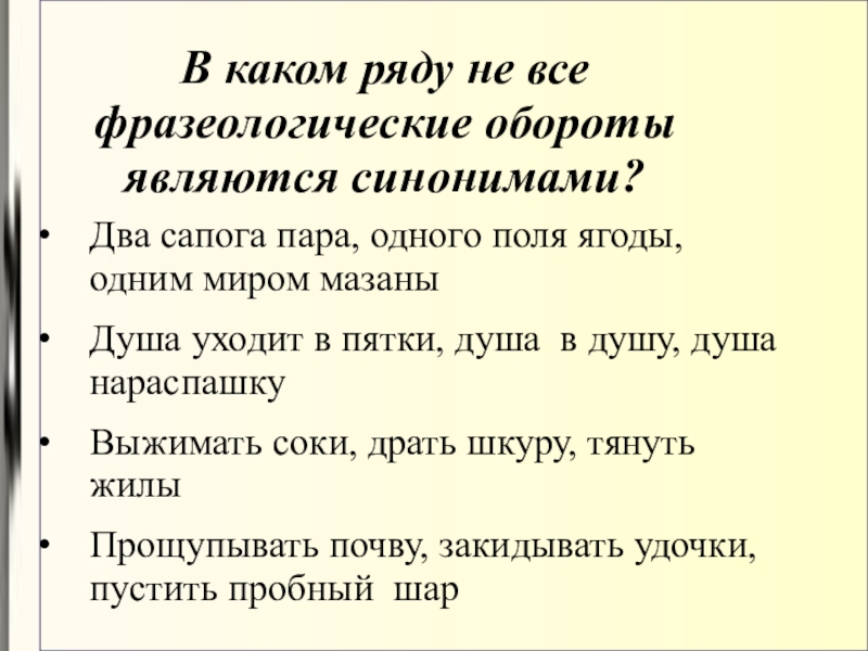 Слайд 10В каком ряду не все фразеологические обороты являются синонимами?