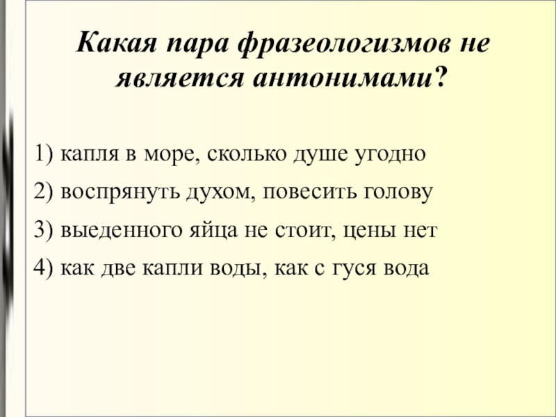 Слайд 11Какая пара фразеологизмов не является антонимами?