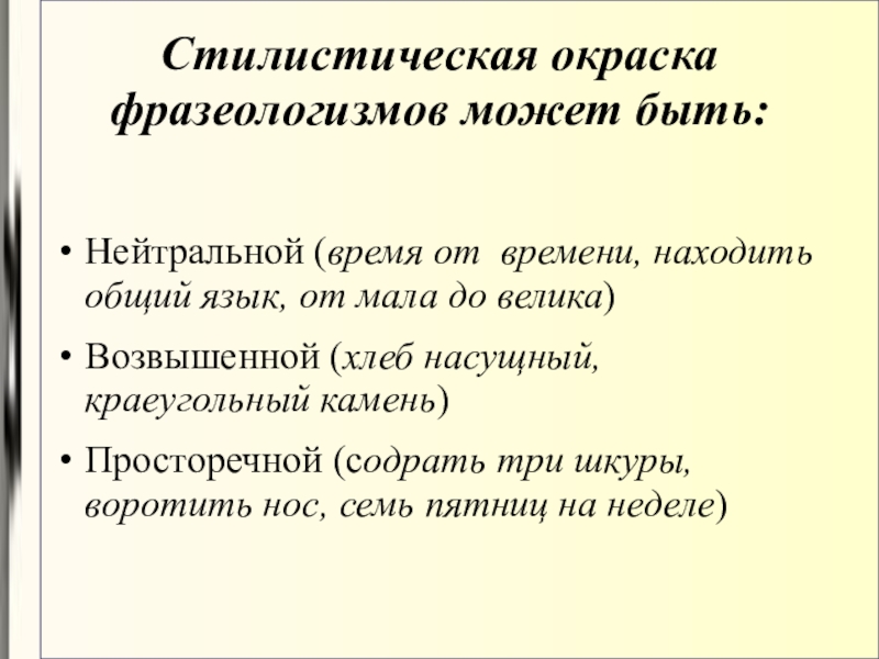 Слайд 20Стилистическая окраска фразеологизмов может быть: