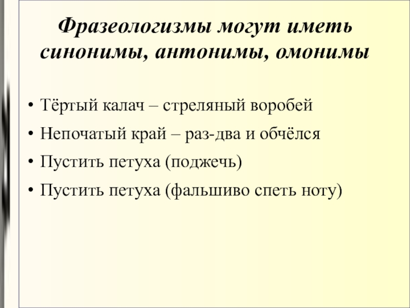 Слайд 19Фразеологизмы могут иметь синонимы, антонимы, омонимы
