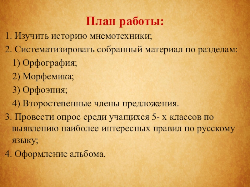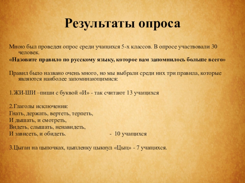 3. Провести опрос среди учащихся 5- х классов по выявлению наиболее интересных правил по русскому языку;
