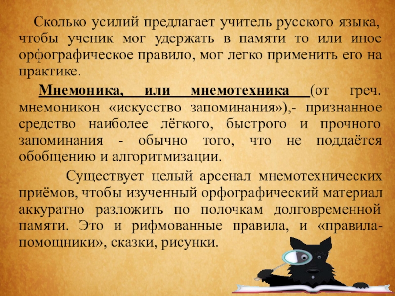 Существует целый арсенал мнемотехнических приёмов, чтобы изученный орфографический материал аккуратно разложить по полочкам долговременной памяти. Это и рифмованные правила, и «правила- помощники», сказки, рисунки.