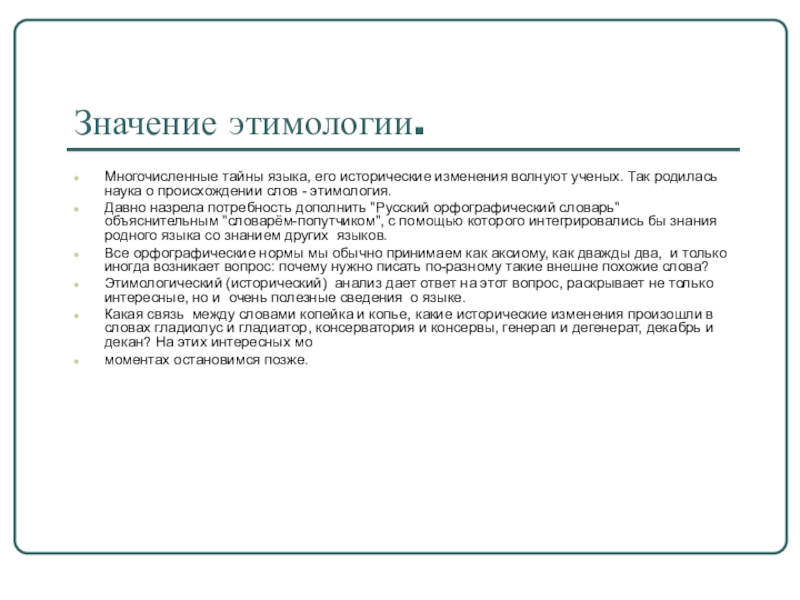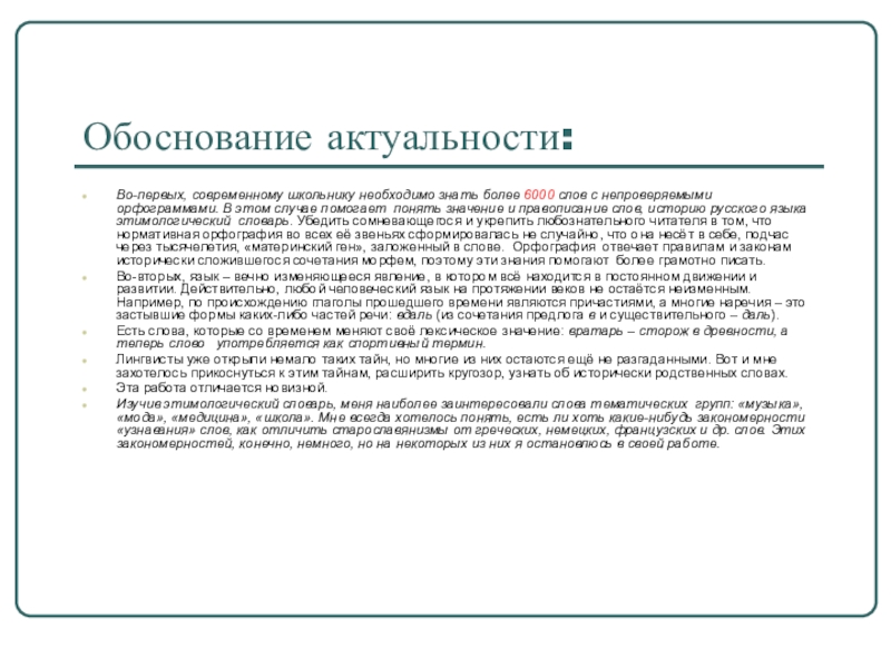 доказала, что русский язык открыт к иноязычным заимствованиям. Их активное усвоение и приспособление к русской грамматической системе - характерная черта, прослеживаемая на всём протяжении исторического развития русского языка, свидетельствующая о гибкости его лексического строя и являющаяся одним из источников его словарного запаса. Так как современному школьнику необходимо знать более 6000 слов с непроверяемыми орфограммами, то в этом случае помогает понять значение и правописание слов этимологический словарь. Орфография отвечает правилам и законам исторически сложившегося сочетания морфем, поэтому эти знания помогают более грамотно писать.