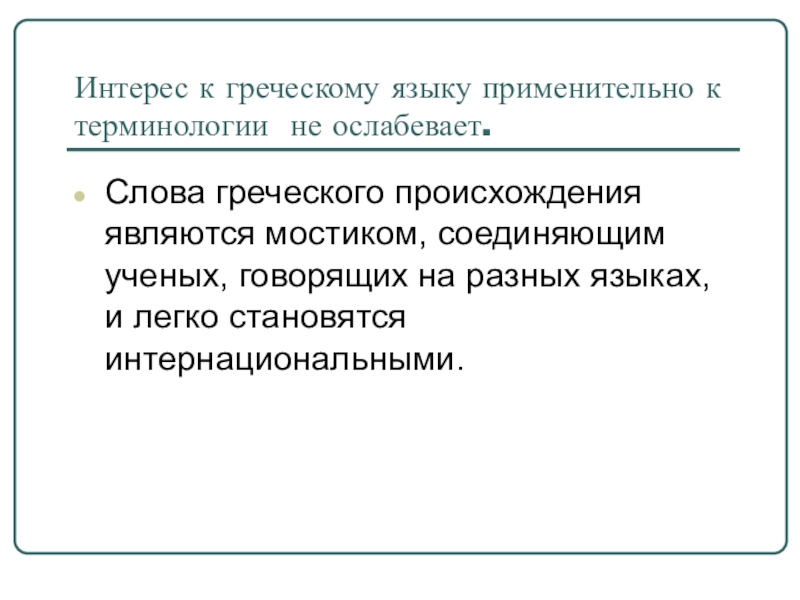 Слайд 31Интерес к греческому языку применительно к терминологии не ослабевает.