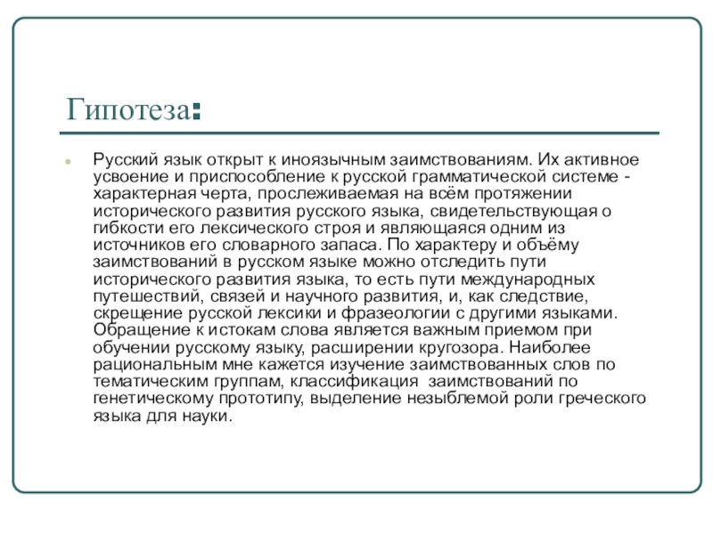 к русской грамматической системе - характерная черта, прослеживаемая на всём протяжении исторического развития русского языка, свидетельствующая о гибкости его лексического строя и являющаяся одним из источников его словарного запаса. По характеру и объёму заимствований в русском языке можно отследить пути исторического развития языка, то есть пути международных путешествий, связей и научного развития, и, как следствие, скрещение русской лексики и фразеологии с другими языками. Обращение к истокам слова является важным приемом при обучении русскому языку, расширении кругозора. Наиболее рациональным мне кажется изучение заимствованных слов по тематическим группам, классификация заимствований по генетическому прототипу, выделение незыблемой роли греческого языка для науки.