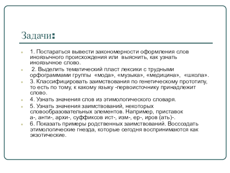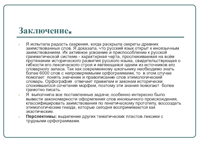 Я выполнила все поставленные задачи, особенно интересно было вывести закономерности оформления слов иноязычного происхождения, классифицировать заимствования по генетическому прототипу, воссоздать этимологические гнезда, которые сегодня воспринимаются как экзотические.