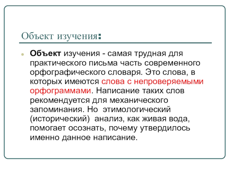 орфографического словаря. Это слова, в которых имеются слова с непроверяемыми орфограммами. Написание таких слов рекомендуется для механического запоминания. Но этимологический (исторический) анализ, как живая вода, помогает осознать, почему утвердилось именно данное написание.