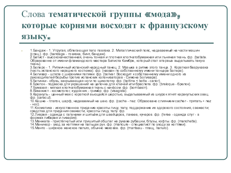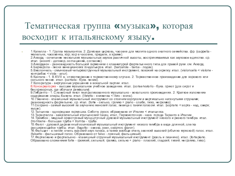 Изучив этимологический словарь, меня наиболее заинтересовали слова тематических групп: «музыка», «мода», «медицина», «школа». Мне всегда хотелось понять, есть ли хоть какие-нибудь закономерности «узнавания» слов, как отличить старославянизмы от греческих, немецких, французских и др. слов. Этих закономерностей, конечно, немного, но на некоторых из них я остановлюсь в своей работе.