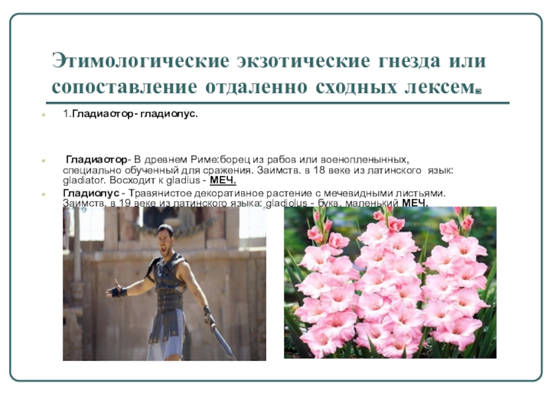 6. Показать примеры родственных заимствований. Воссоздать этимологические гнезда, которые сегодня воспринимаются как экзотические.
