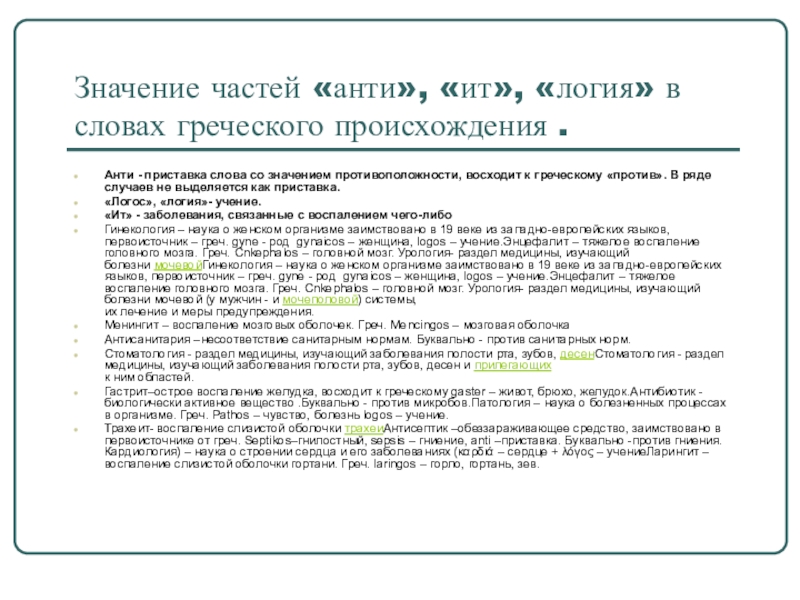 Слайд 32Значение частей «анти», «ит», «логия» в словах греческого происхождения .