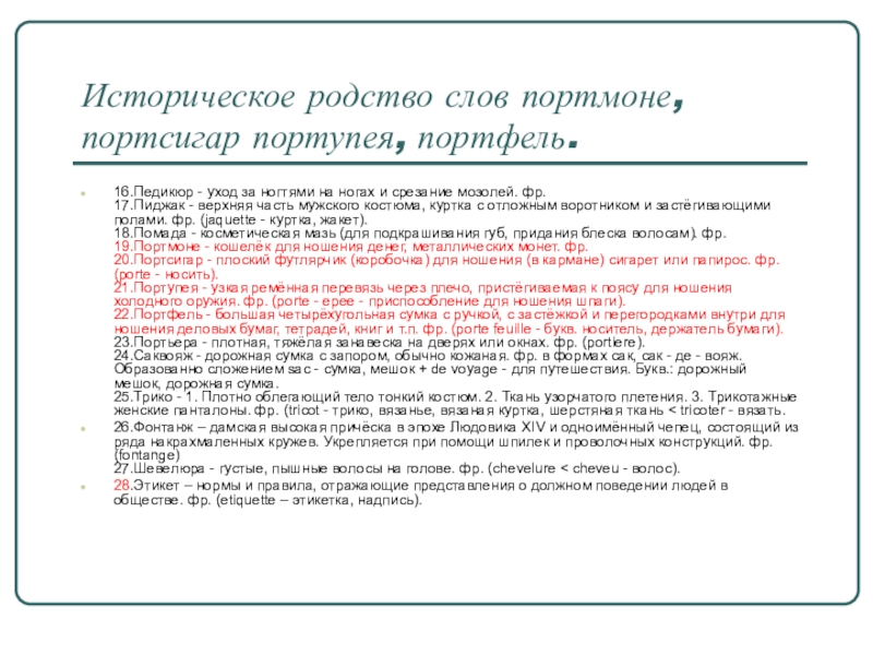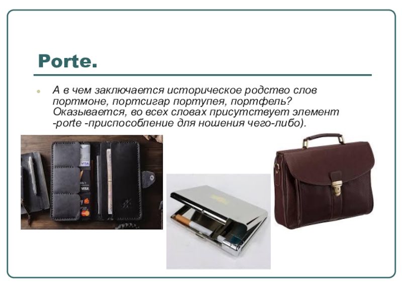 Слайд 25Историческое родство слов портмоне, портсигар портупея, портфель.