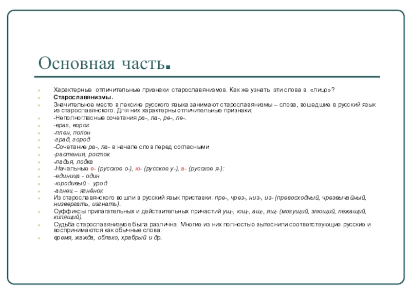 Значительное место в лексике русского языка занимают старославянизмы – слова, вошедшие в русский язык из старославянского. Для них характерны отличительные признаки: