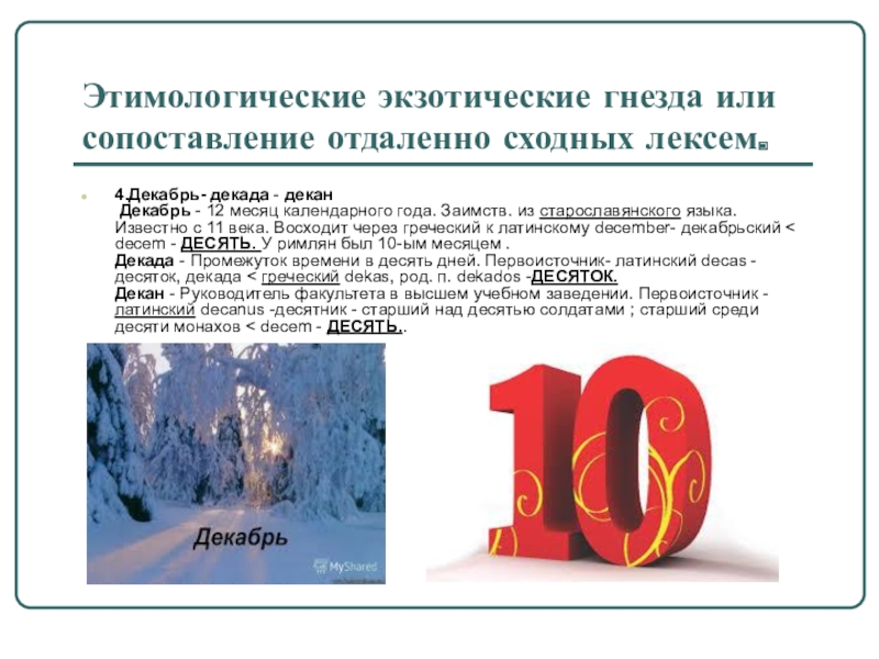 Декабрь - 12 месяц календарного года. Заимств. из старославянского языка. Известно с 11 века. Восходит через греческий к латинскому december- декабрьский < decem - ДЕСЯТЬ. У римлян был 10-ым месяцем .