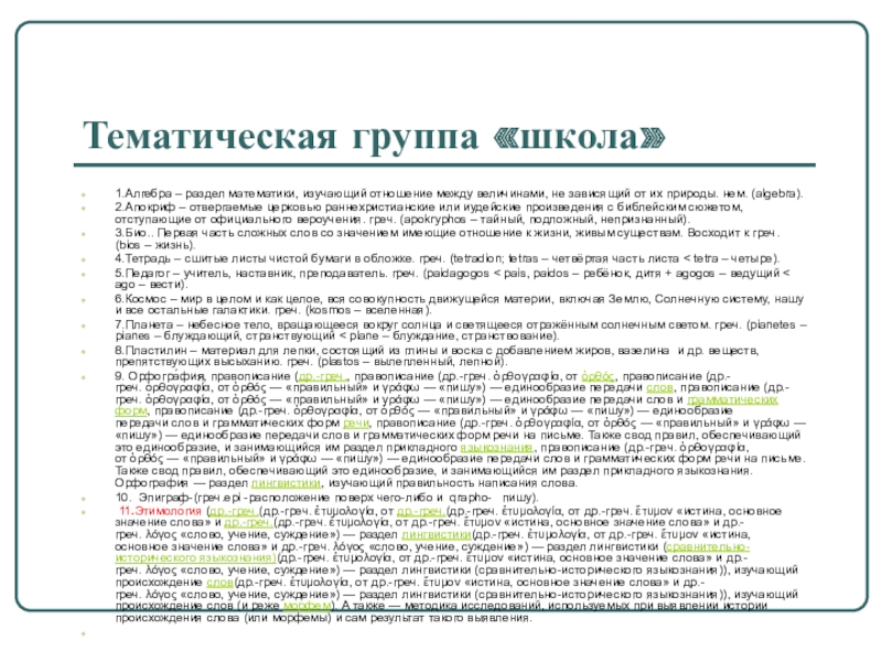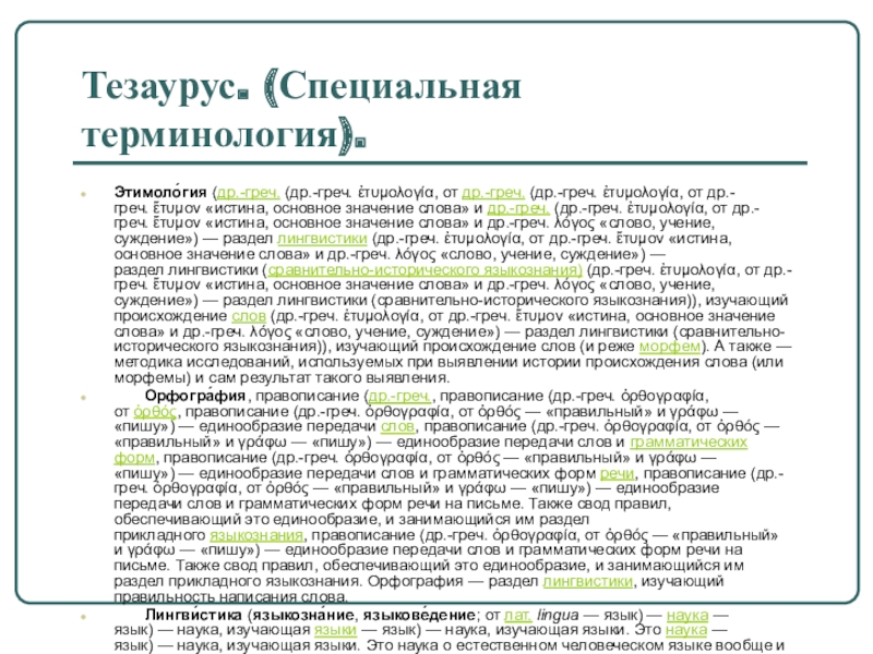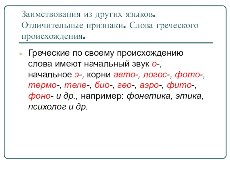 Слайд 15Заимствования из других языков. Отличительные признаки. Слова греческого происхождения.