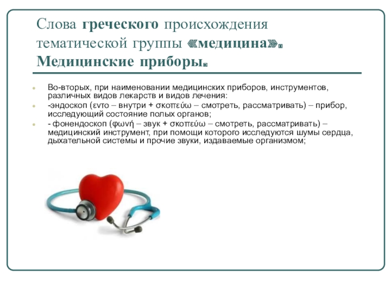 Слайд 30Слова греческого происхождения тематической группы «медицина». Медицинские приборы.