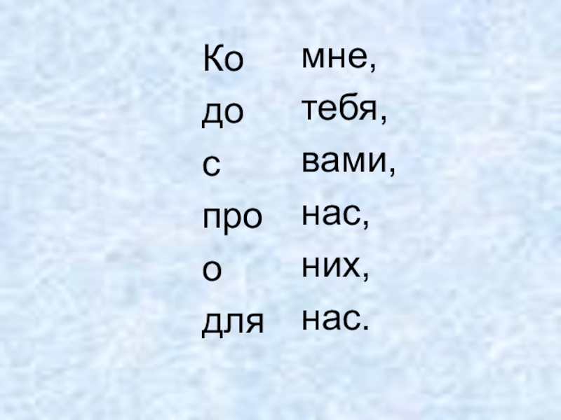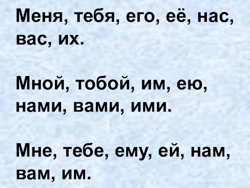 Слайд 5Меня, тебя, его, её, нас, вас, их. Мной, тобой, им, ею, нами,