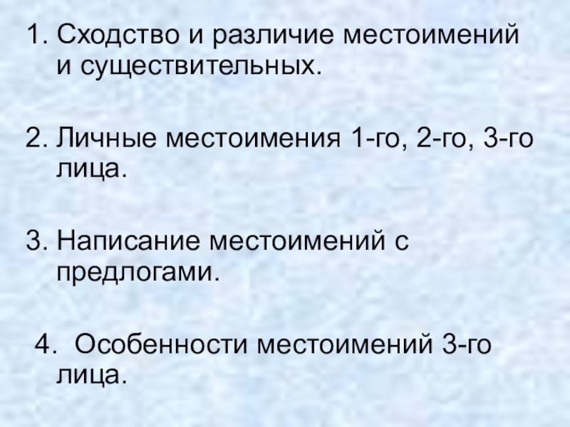Сходство и различие местоимений и существительных.Личные местоимения 1-го, 2-го, 3-го лица.Написание местоимений с предлогами.4. Особенности местоимений 3-го лица.