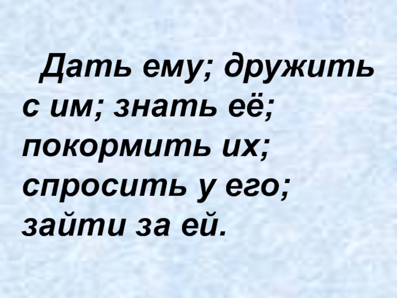 Слайд 10 Дать ему; дружить с им; знать её; покормить их; спросить у