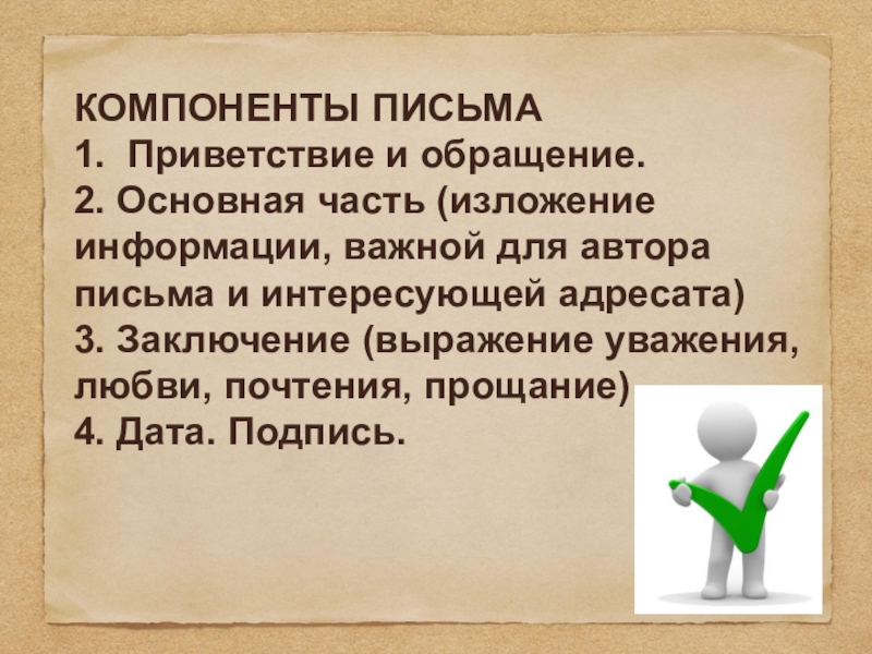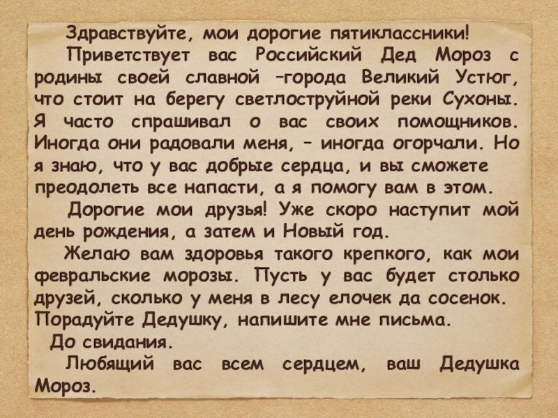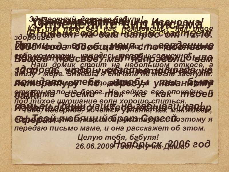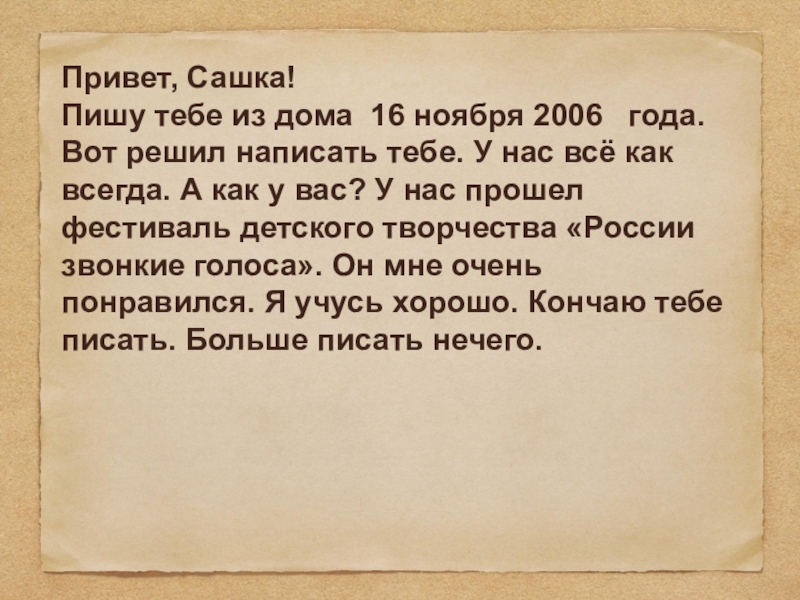 Прими от меня сердечные пожелания: хочу, чтобы ты была здорова, чтобы счастье никогда не покидало тебя, чтобы ты была любима всеми так же как твоей семьей. Пиши чаще, не забывай нас!