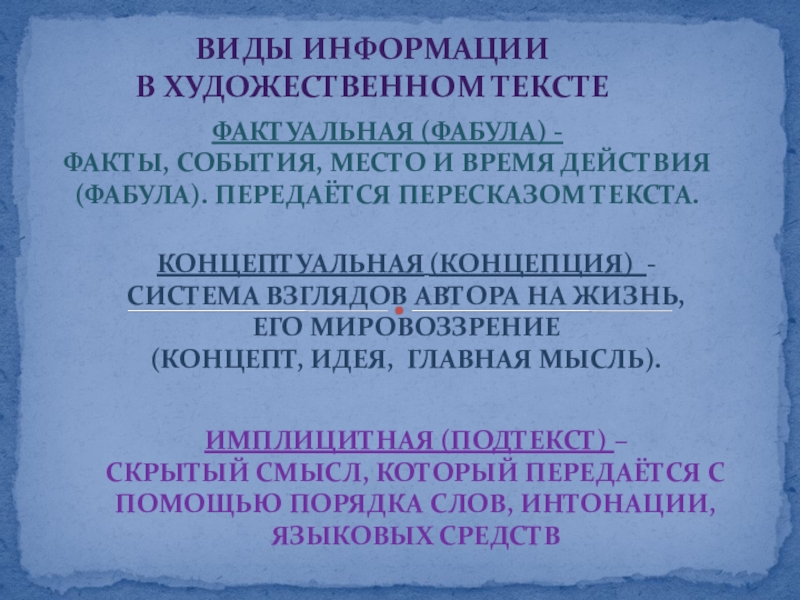 ФАКТЫ, СОБЫТИЯ, МЕСТО И ВРЕМЯ ДЕЙСТВИЯ (ФАБУЛА). ПЕРЕДАЁТСЯ ПЕРЕСКАЗОМ ТЕКСТА.