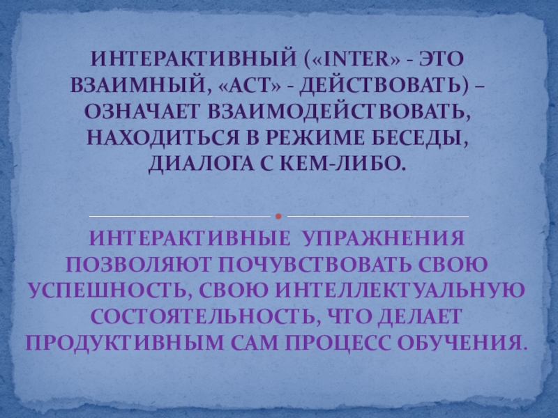 ИНТЕРАКТИВНЫЕ УПРАЖНЕНИЯ ПОЗВОЛЯЮТ ПОЧУВСТВОВАТЬ СВОЮ УСПЕШНОСТЬ, СВОЮ ИНТЕЛЛЕКТУАЛЬНУЮ СОСТОЯТЕЛЬНОСТЬ, ЧТО ДЕЛАЕТ ПРОДУКТИВНЫМ САМ ПРОЦЕСС ОБУЧЕНИЯ.