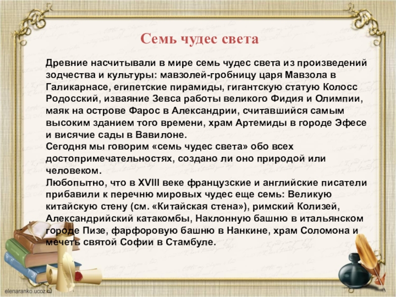 зодчества и культуры: мавзолей-гробницу царя Мавзола в Галикарнасе, египетские пирамиды, гигантскую статую Колосс Родосский, изваяние Зевса работы великого Фидия и Олимпии, маяк на острове Фарос в Александрии, считавшийся самым высоким зданием того времени, храм Артемиды в городе Эфесе и висячие сады в Вавилоне.