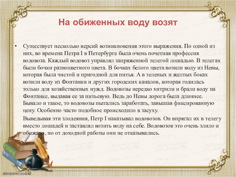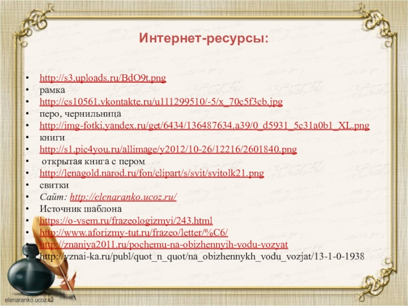Интернет-ресурсы:http://s3.uploads.ru/BdO9t.png рамкаhttp://cs10561.vkontakte.ru/u111299510/-5/x_70c5f3cb.jpg перо, чернильницаhttp://img-fotki.yandex.ru/get/6434/136487634.a39/0_d5931_5c31a0b1_XL.png книгиhttp://s1.pic4you.ru/allimage/y2012/10-26/12216/2601840.png открытая книга с перомhttp://lenagold.narod.ru/fon/clipart/s/svit/svitolk21.pngсвиткиСайт: http://elenaranko.ucoz.ru/Источник шаблонаhttps://o-vsem.ru/frazeologizmyi/243.htmlhttp://www.aforizmy-tut.ru/frazeo/letter/%C6/http://znaniya2011.ru/pochemu-na-obizhennyih-vodu-vozyathttp://yznai-ka.ru/publ/quot_n_quot/na_obizhennykh_vodu_vozjat/13-1-0-1938