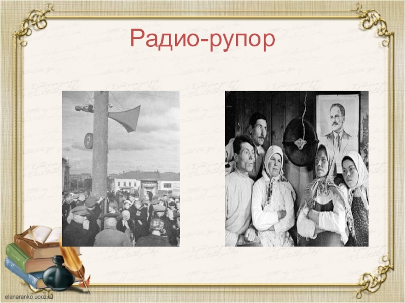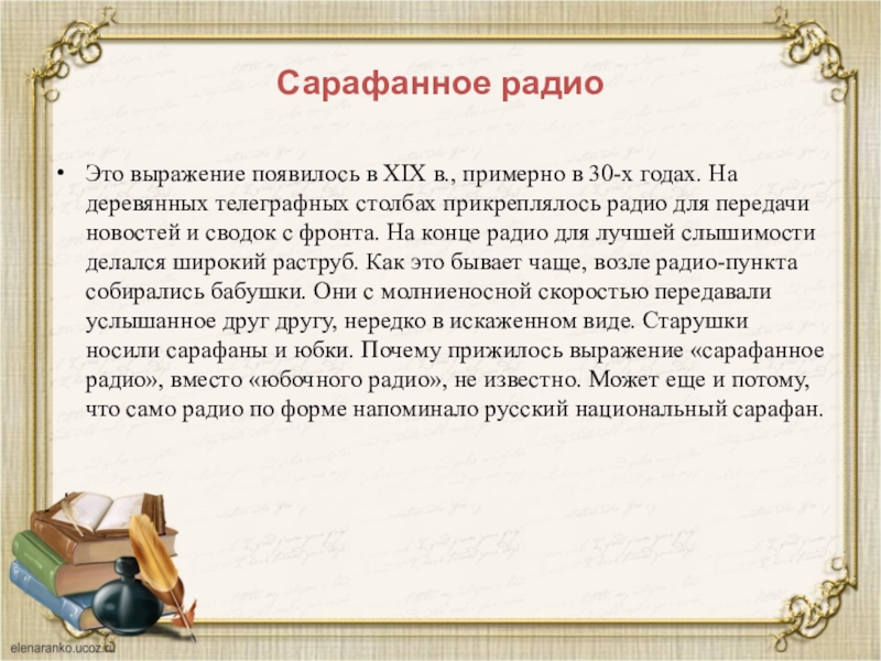 На деревянных телеграфных столбах прикреплялось радио для передачи новостей и сводок с фронта. На конце радио для лучшей слышимости делался широкий раструб. Как это бывает чаще, возле радио-пункта собирались бабушки. Они с молниеносной скоростью передавали услышанное друг другу, нередко в искаженном виде. Старушки носили сарафаны и юбки. Почему прижилось выражение «сарафанное радио», вместо «юбочного радио», не известно. Может еще и потому, что само радио по форме напоминало русский национальный сарафан.