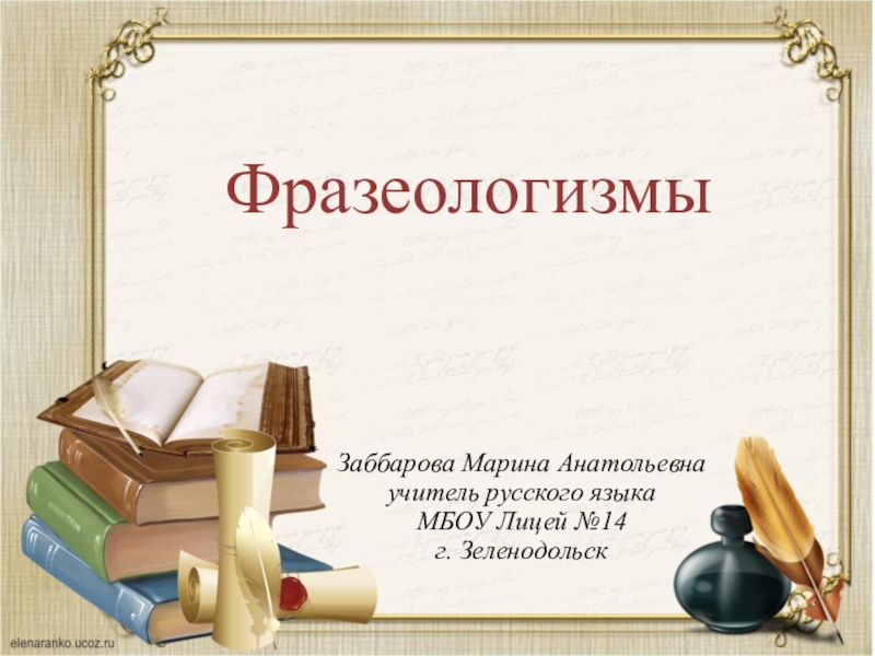 ФразеологизмыЗаббарова Марина Анатольевнаучитель русского языкаМБОУ Лицей №14г. Зеленодольск