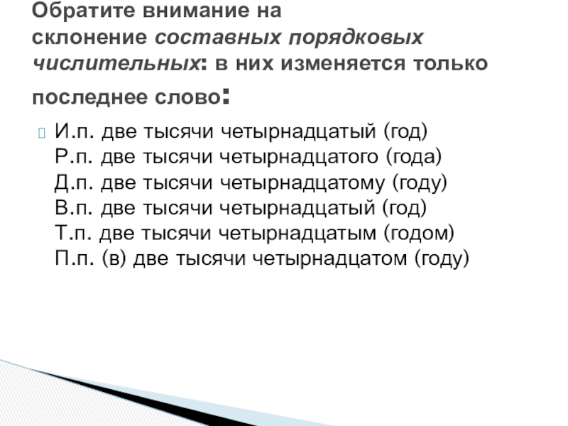 Обратите внимание на склонение составных порядковых числительных: в них изменяется только последнее слово: