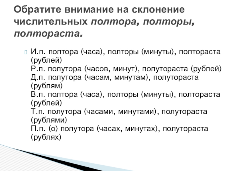 Обратите внимание на склонение числительных полтора, полторы, полтораста.