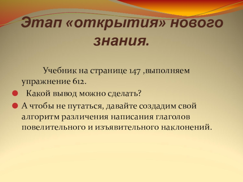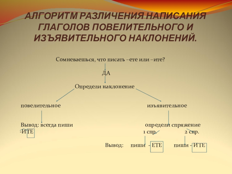 Слайд 10АЛГОРИТМ РАЗЛИЧЕНИЯ НАПИСАНИЯ ГЛАГОЛОВ ПОВЕЛИТЕЛЬНОГО И ИЗЪЯВИТЕЛЬНОГО НАКЛОНЕНИЙ.