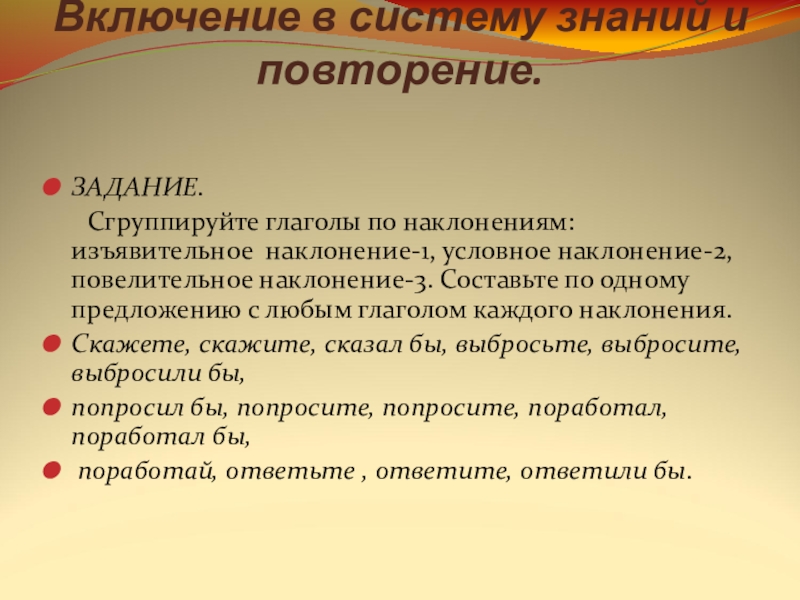 по наклонениям: изъявительное наклонение-1, условное наклонение-2, повелительное наклонение-3. Составьте по одному предложению с любым глаголом каждого наклонения.