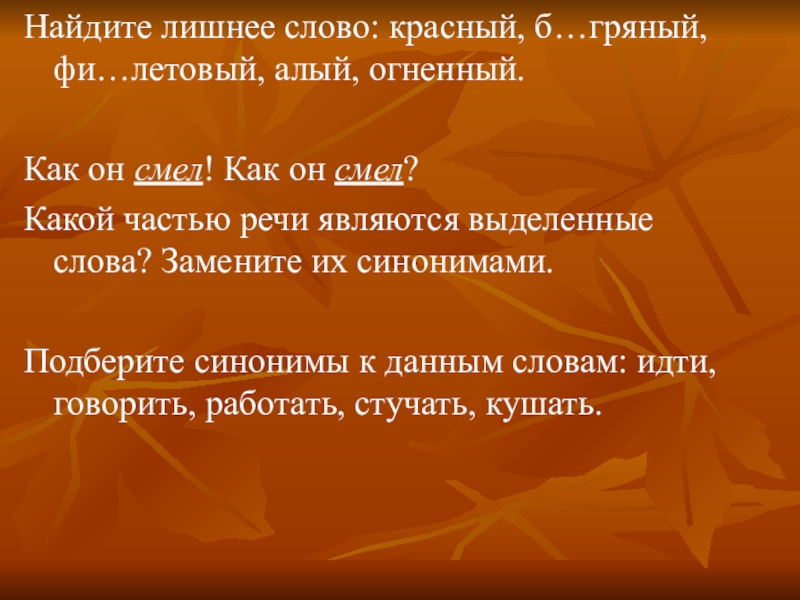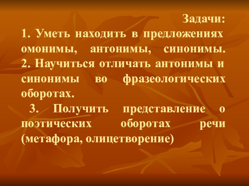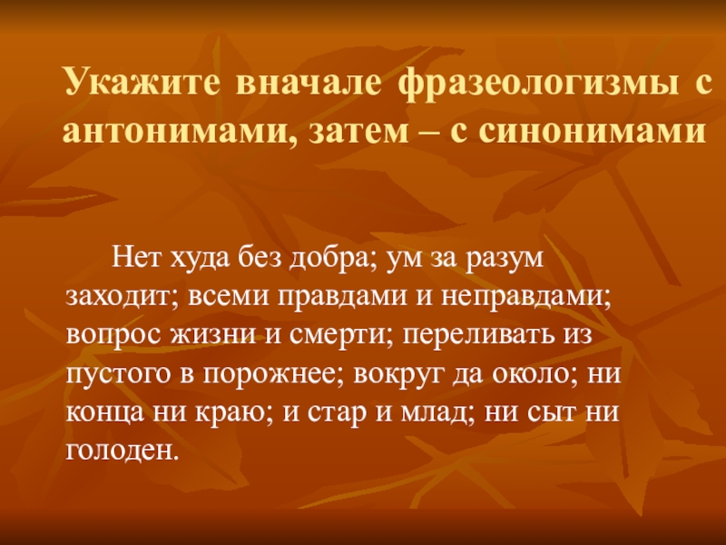 Укажите вначале фразеологизмы с антонимами, затем – с синонимами