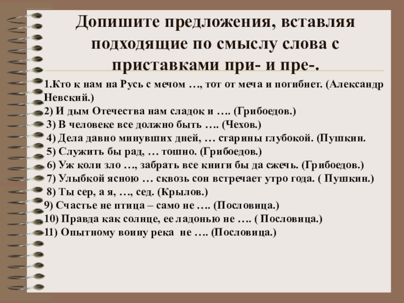 Допишите предложения, вставляя подходящие по смыслу слова с приставками при- и
