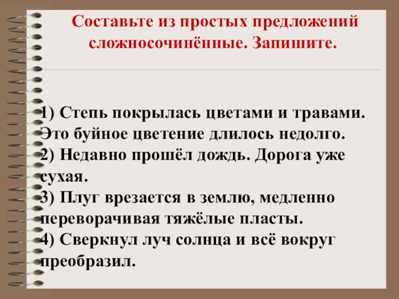 Слайд 16 Составьте из простых предложений сложносочинённые. Запишите.