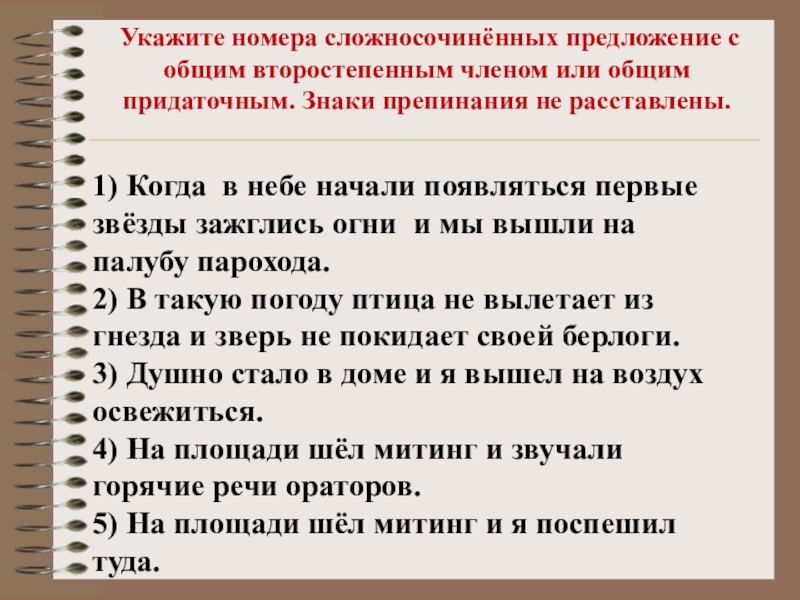 Слайд 12 Укажите номера сложносочинённых предложение с общим второстепенным членом или общим