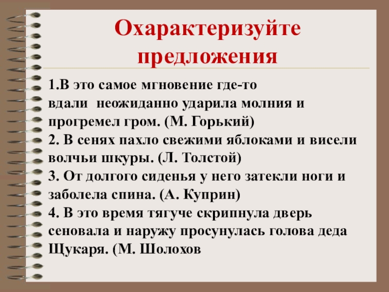 4. В это время тягуче скрипнула дверь сеновала и наружу просунулась голова деда Щукаря. (М. Шолохов