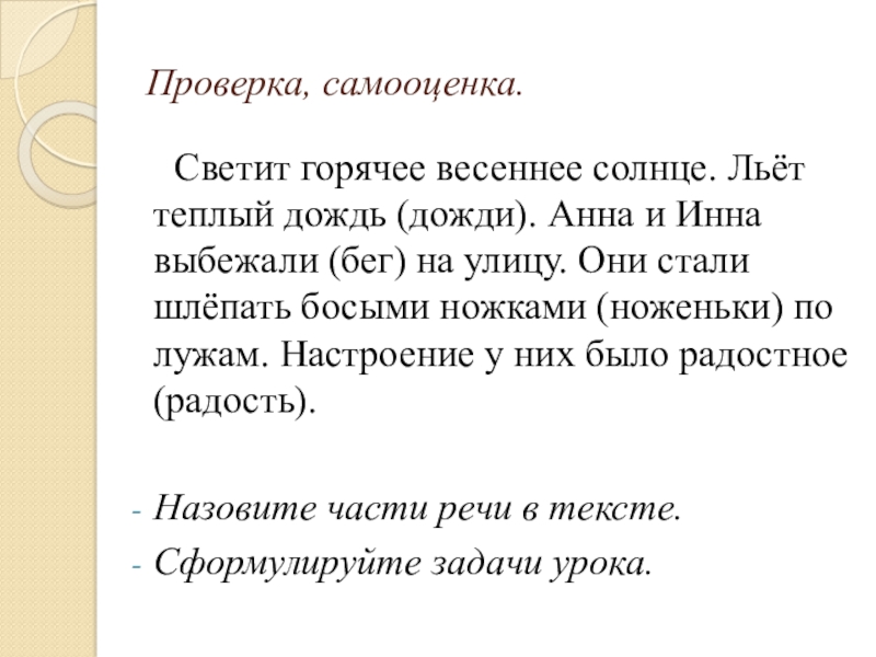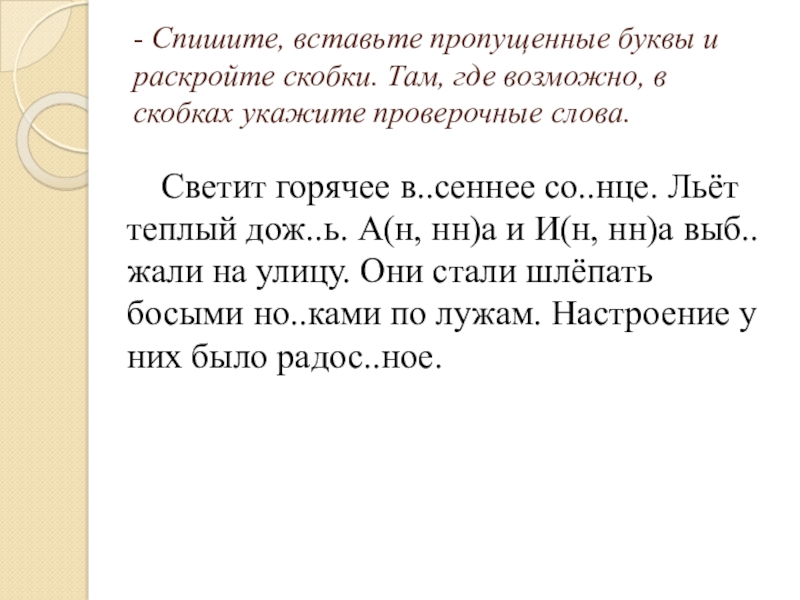 Светит горячее в..сеннее со..нце. Льёт теплый дож..ь. А(н, нн)а и И(н, нн)а выб..жали на улицу. Они стали шлёпать босыми но..ками по лужам. Настроение у них было радос..ное.
